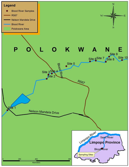 The Blood River is located in the Seshego area about 14.5 km away from Polokwane, the capital city of Limpopo Province. The river originates in the west of the Polokwane municipal area. The municipal and domestic wastes, presence of illegal dumping sites close to the river banks, lack of waste removal services and absence of storm water drainage among others contribute to the contamination of the Blood River [15]. During the sampling period, dumping sites near different parts of the Blood River, sand mining activities and direct discharge of effluents into the river were observed and as results, sewage effluents can introduce other chemicals and PTEs into the water system. Therefore, the aforementioned wastes and anthropogenic activities could possibly elevate the levels of PTEs in the Blood River. Sampling sites in the Blood River are shown in Figure 1.