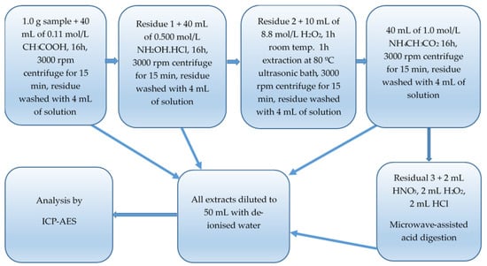 An additional fourth stage was added in which the residue was mineralised following the procedure described in method A. The solution was topped to 50 mL with deionised water and stored in a refrigerator until analysis. A flow diagram of the BCR sequential extraction method is shown in Figure 2.