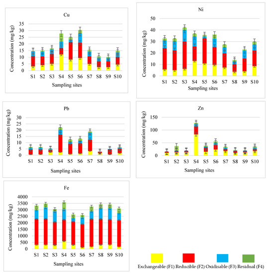 The partitioning pattern of Cu in the reducible fraction was highly favourable in all the sites except site 4 (Figure 3). Copper was primarily associated with the reducible fraction (37 to 53%), followed by the exchangeable (21 to 33%), oxidisable (20 to 24%) and lastly, the residual fraction (2 to 11%). A different fractionation pattern was observed in site 4 where Cu was dominant in the exchangeable fraction (44%) followed by the residual fraction (22%), reducible fraction (18%) and finally the oxidisable fraction (17%). Wali et al. [35] and Davutluoglu et al. [36], reported the dominance of Cu in the exchangeable and residual fractions in their studies. Wali et al. [35] reported 39.70% Cu in the exchangeable fraction and 60.30% in the residual fraction.