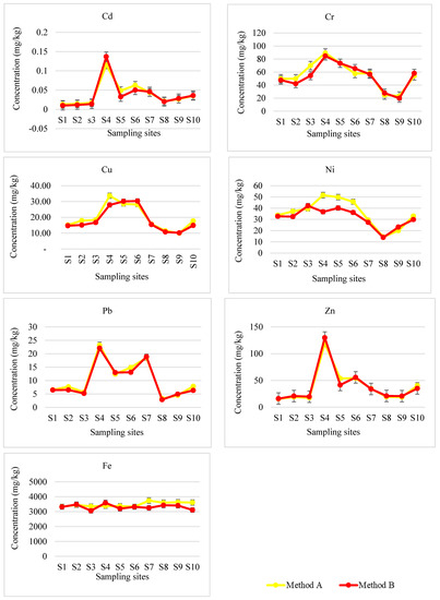 Following the same procedure, with slight variation in the volume of the reagents, Melaku et al. [18] reported LOD values of 0.83, 0.59, 0.08, 0.67, 0.64, 0.03 and 0.15 ng·g−1 for Cr, Fe, Ni, Cu, Zn, Cd and Pb, respectively. These LOD values were comparable with the LODs, in this study, for Cu, Cd and Pb. The LODs were adequate for quantification of PTEs in the analysed sediment samples.