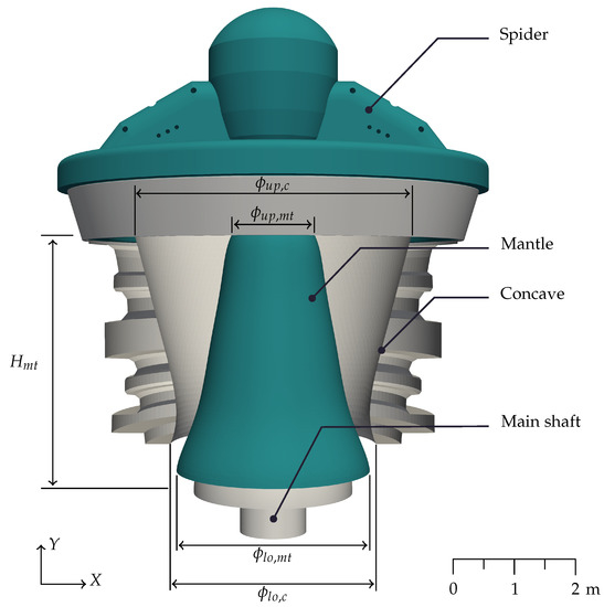 The Metso 60-110 gyratory crusher was 3D modeled in an open-source mesh generator software (Gmsh 4.8.4 developed by Christophe Geuzaine and Jean-François Remacle, Belgium) by using the available data on the website of the manufacturer, and the main parameters used are listed in Table 1. Only the parts in contact with the particles are modeled: the main shaft, mantle, concave, and spider, as shown in Figure 1. The mantle is modeled with a smooth profile. Splines were used for better characterization of mantle and concave curvatures. It is easy to compute, by using mathematical functions of the geometries, the linear relationship between the , , and height of the main shaft [37]. Moreover, the crusher feed hopper was modeled to achieve a more realistic representation of the ore falling into the crushing chamber (or crusher cavity) and settling in it.