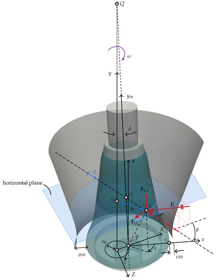 Geometric parameters of the gyratory crusher, force decomposition, and moving frame of reference. Tilt angle, ; pivot point, Q; eccentricity at the base of the mantle, ; open side setting, ; closed side setting, ; axial axis of the main shaft, ; the fixed and moving frame of reference are presented for the simulation time t such that . A force is applied in point A, showing their radial ; transverse ; and vertical components. The position of A is represented by , , and , and the radial direction is represented by . Both points O and belong to the horizontal plane.