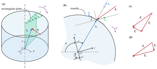 (a) Mixer with a mobile rectangular plate rotating around the vertical axis. The force is applied at the rectangular plate. (b) Cross-section of the mantle with a vector force, , applied at point A. The node i and all the cross-section has velocity . (c) Rectangular decomposition of the force, , in radial and transverse direction. (d) Rectangular decomposition of the force, , at the x-axis and z-axis.