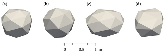 The ROM ore copper was simulated using polyhedral particles with four different shapes that are represented by a vertical aspect ratio, a horizontal aspect ratio, number of corners, and a super-quadric degree. These parameters were selected by André and Tavares [18] and are representative of the real shape of the rocks. The simulated particles are presented in Figure 4, where the presented scaled size of these particles is the maximum size used in this work. The Tavares breakage model is used, which has shown a good response when simulating different types of ore [18,23]. The material and breakage parameters of the particles of copper ore used in this work were adjusted by Tavares et al. [23] and can be observed in Table 2 and Table 3. The work index, , is 13.5 kWh/t [23]. The feed particle size distribution utilized is characterized by mm and was selected according to the recommendation of the manufacturer and considers a reasonable simulation time. The smallest particle size in the feeding is 70 mm with 39.42% in mass. Despite being a large size compared to the fine particles found experimentally, it can well represent the physical situation.