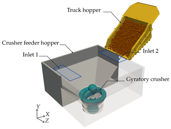 The simulated gyratory crusher is fed by CAT 797F trucks. The nominal capacity of the truck is 293 tons. The truck’s hopper rotates for 15 seconds until it reaches an inclination of 45; then, the mass flow rate of the inlet is 70,320 t/h and the average download speed is 1.8 m/s. To simplify the model, it is possible to set the discharge of the ore by using a rectangular particle inlet per truck with the parameters already mentioned. The most interesting scenario is when two trucks simultaneously feed the crusher; thus, the two inlets are located over the hopper, as is detailed in Figure 5. As the inlet mass flow rate is greater than the expected output mass flow rate, which is between 5000 and 9000 t/h, the crusher will be operating in choke feed conditions.