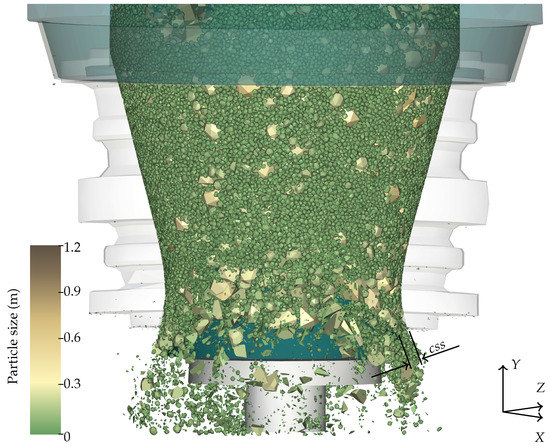 Snapshot of the base simulation at s showing a frontal section of the crusher. The particles are colored by their particle size, and the concave was cut to observe the particles. The position of the closed side setting, , is also presented.