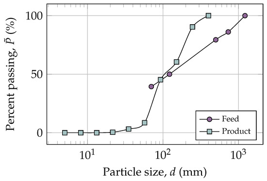 The particle size distribution of the feed and product are exhibited in Figure 8. Comparing the and the feed PSD, more than half of the particles can pass through the crushing chamber without being broken. In the Figure 7, several fine particles with sizes less than 70 mm can be observed in the chamber. For the time s, 8.64% of the mass of fine particles are located in the crusher cavity without been crushed. All the particles of the product have a size less than 400 mm and a equal to 116.43 mm.