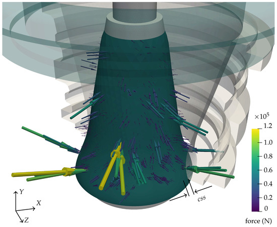 Figure 9 illustrates an example of the prediction of forces on the mantle of the gyratory crusher with the DEM simulation in steady state. Each vector represents the nodal force in the mantle for the given time step. Half of the concave is shown, the hidden part of the concave corresponds to the section where the compression is carried out. The location of the distance is also drawn. As the main shaft rotates in the negative Y direction, the position of the moves in the same direction. The forces cover a surface of half of the mantle (where the concave is hidden) and increase its magnitude when the mantle approaches the concave. A particle–boundary contact can generate more of one nodal force depending on the geometry of the contact, and that is why the nodal forces can be observed to be grouped together.
