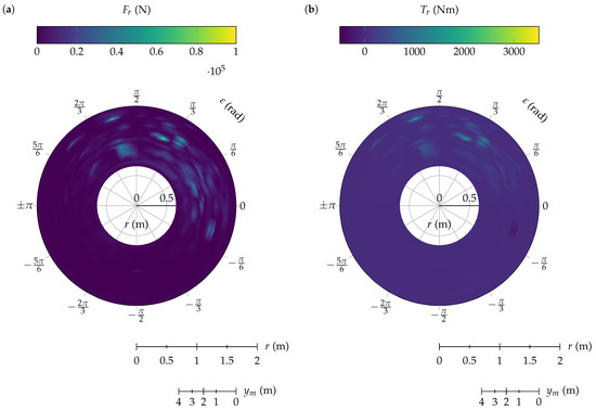 For the purpose of achieve a representative force distribution that is comparable in different time steps, a moving frame of reference in polar coordinates relative to main shaft is used, as described in Section 2. A planar force distribution in polar coordinates can be obtained, and all the mantle surface can be analyzed in a simple surface plot instead of a 3D graphical representation. This type of graphics can be extracted in all DEM software in terms of normal or shear stress [15], but it is not good for calculating power in the gyratory crusher because only radial forces must be considered in power and torque calculations.