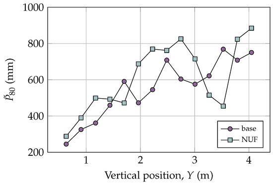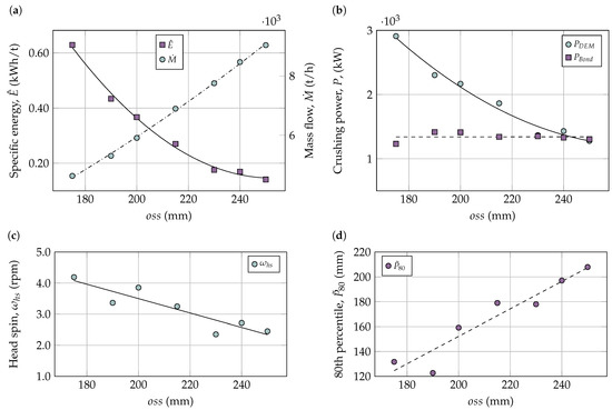 Table 6 provides the efficiency and performance of the crusher changing the . The crushing power for mm, base case, is close to the experimental value, 1329.4 kW, and the behavior of the other configurations is as expected. The model correctly predicts the throughput of the crusher because all the mass flow rates of the product calculated in the simulations performed, , are quite close to that indicated by the manufacturer . The error is less than 20% between mm and 200 mm, and the error is less than 10% between 215 mm and 250 mm, which is low compared with the values obtained in the literature [3,16,18]. The product size, represented by the value, is near , as indicated by the manufacturer [43]. As the throughput, product size, and power are close to the ones reported by the manufacturer and the experimental data, the simulation is considered validated.