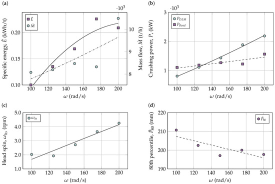 Simulations are carried out by varying the operating conditions of the crusher, such as the eccentric velocity and the open side setting . To change the , the height of the main shaft was changed in the same manner that it is performed in crushing plants. Four different eccentric rotation speeds and seven different open side settings are contemplated, as is presented in Table 5. The power and throughput obtained in these calculations are compared to the data given by manufacturer specifications for different operating conditions. It is considered a base case, with mm and a of 150 rpm.