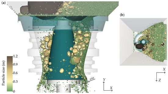 Figure 7 presents a snapshot of the DEM simulation of the gyratory crusher with mm and rpm, the base case, at simulation time s. At that time, the crushing chamber is full of particles with a total mass of 66,410 kg. In the crushing chamber there are 75,000 particles and there are between 100,000 and 200,000 particles in the entire domain. The median mass flow rate of the product is 8473.0 t/h. At the top of the crusher cavity, the mean particle velocity in the vertical direction is 0.48 m/s, and it is 2.02 m/s at the bottom. As the total particle mass in the chamber and the median mass flow rate of the product remain with low variations, it is considered to be in a steady state.