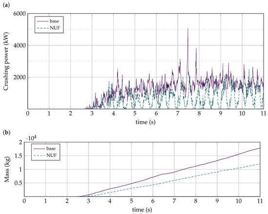 On the other hand, by utilizing data from DEM simulations, the crushing power can be calculated with the contact information between particles and the mantle in terms of the crushing torque [16]. In the same manner as Bond’s equation, the no-load or idle power must be added to the crushing power in order to obtain the overall power to operate this machine [27].