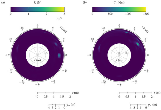 As e is a function of the height Y, Equation (10) depends on r and . With that expression, we can find the maximum and minimum of the torque by considering the contact force as constant. A critical point was not observed by studying the first partial derivative regarding and r. By analyzing the boundary, it was found that the torque was maximum in and , and it was minimum in and , where is the maximum radius of the mantle located at the bottom. Moreover, there is a change in the sign of the torque. If we consider the torque positive in , in the torque will be negative. Besides, from (10) it is possible to note that the torque is zero for and because the moment arm of the radial force is null.