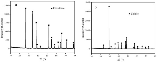 Pure minerals of cassiterite and calcite used in the experiments were obtained from Yunnan province, China. After a series of crushing (Jaw crusher), dry grinding (Ceramic ball mill), and screening (Standard sieve), minerals with the particle size of 0.037 mm to 0.074 mm were used for flotation experiments. According to the X-ray diffraction of cassiterite (a) and calcite (b) shown in Figure 1, the samples are of high purity. The samples are high-grade cassiterite and calcite with a purity greater than 99%.
