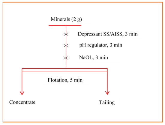 Flotation tests consists of single minerals experiments and artificial mixed minerals experiments. Flotation experiments were carried out in XFG flotation machine at a spindle speed of 1200 rpm. For each single mineral flotation experiment, 2 g of pure mineral and 35 mL of ultrapure water was added to the flotation cell with a capacity of 40 mL. For artificially mixed minerals flotation experiments, 2 g of the mixed mineral consisted of 1 g cassiterite and 1 g of calcite. The flotation experiments were carried out according to the flowsheet shown in Figure 2. After artificial scraping, filtering, drying and weighing, the concentrates and tailings were collected for recovery and grade measurements. The grades of concentrate and tailings of artificial mixed ore are measured by chemical titration analysis. Each experiment was repeated three times. The average was the final result, and the error bar was the standard deviation.