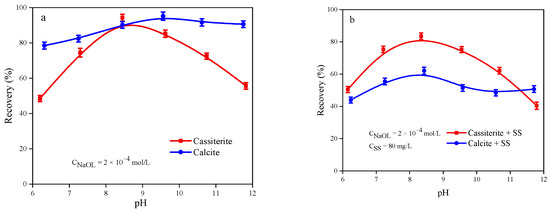 NaOL is one of the most commonly used collectors for cassiterite flotation [25]. The flotation recovery of cassiterite and calcite in the presence of NaOL is presented in Figure 3a. As can be seen in Figure 3a, under different pH, because the occurrence state of NaOL and the dissolution behavior of cassiterite are different, leading to a certain difference in the flotation recovery of cassiterite. However, on the whole, cassiterite shows a good flotation performance in the presence of NaOL, especially when the pH is 8.45, the recovery of cassiterite reaches 94.25%. As for calcite, in the whole flotation pH range, the flotation recoveries of calcite are higher than 80% indicating the selectivity of NaOL is poor. When the depressant SS is added, the flotation recoveries of cassiterite and calcite are shown in Figure 3b. As can be seen from Figure 3b the inhibition effect of SS on calcite is stronger than that on cassiterite because the recovery rate of calcite is reduced to about 50%, while the recovery rate of cassiterite is only reduced by about 10%. It is clear that the flotation separation of cassiterite from calcite is still very hard with the depressant SS alone since the flotation recovery of calcite is still very high.