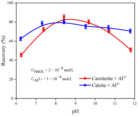 Al3(SO4)2 is a common flotation reagent, which is used as regulator or flocculant. The flotation recovery of cassiterite and calcite in the presence of Al3+ is shown in Figure 4. As shown in Figure 4, with the addition of Al3+, both the flotation recoveries of cassiterite and calcite decrease to a certain extent, and the recovery of calcite decreases more obviously. This may be because the added aluminum ions will combine with the collector sodium oleate to form aluminum oleate, which consumes part of the collector. However, overall, under the action of aluminum ions, the recovery rate of calcite is still very high between 60% and 80%. It is obvious that the flotation separation of cassiterite and calcite is still not feasible in the presence of Al3(SO4)2.