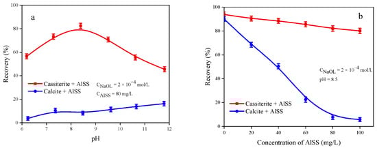 Effect of pH (a) and concentration (b) of SS on the flotation recovery of cassiterite and calcite.
