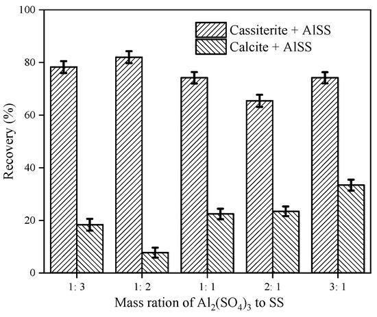 For the application of mixed reagents, the mixing ratio of different components has a significant impact on the performance of combination treatment [26]. Figure 6 demonstrates the influence of the mass ratio between Al3+ and SS on the flotation recovery of cassiterite and calcite. As shown in Figure 6, with the increase of the mass ratio of Al2(SO4)3 to SS, the flotation recovery of cassiterite fluctuates slightly, while the flotation recovery of calcite first decrease first and then increases. With the mass ratio of Al2(SO4)3: SS = 2:1, the flotation recovery difference between cassiterite and calcite is the largest, reaching 74.3%, and the flotation recovery of cassiterite is the highest among the investigated mass ratios. This is also the reason why the mass ratio of Al3+ to SS is chosen as 2:1 during the research.