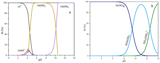Figure 7 is the species distribution diagram of Al3+ (a) and the distribution coefficient of water glass (b). As can be seen in Figure 6, with the increase of pH, the main forms of Al3+ in the solution are Al3+, Al(OH)2+, Al(OH)2+, Al(OH)3, and Al(OH)4−, while the main forms of water glass in the solution are Si(OH)4, SiO(OH)3−, and SiO2(OH)22−. When AlSS is added to the pulp, there are two possible ways for the colloidal particles to adsorb on the mineral surface. The first possibility is that the positively charged Alm(OH)n3m−n colloidal particles first adsorbes on the mineral surface, creating active sites for the adsorption of the negatively charged SiOm(OH)n4−2m−n colloidal particles. The second possibility is that the positively charged Alm(OH)n3m−n colloidal particles and the negatively charged SiOm(OH)n4−2m−n colloidal particles will form negatively charged mixed colloidal particles, which can adsorb on the surface of the mineral. Because the AlSS is pre-configured, the latter explanation is more applicable to this system.