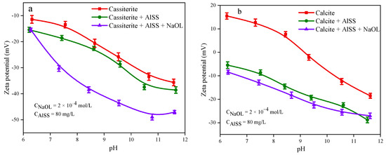 Figure 8 depicts the effect of pH on the zeta potential of cassiterite and calcite in different systems. As shown in Figure 8a, compared with the zeta potential of cassiterite in the pure water, the addition of AlSS leads to a negligible negative shift of cassiterite among the investigated pH range (less than 5 mV). The phenomenon can be explained by the fact that the negatively charged cassiterite surface is difficult to absorb the negatively charged AlSS colloidal particle through electrostatic attraction. In comparison, with the addition of AlSS, the zeta potential of calcite decreases sharply among the investigated pH range, which may be closely related to the positive surface potential of calcite (Figure 8b). In the presence of AlSS and NaOL, the zeta potential of cassiterite decreases significantly (more than 20 mV) and, within the studied pH range, the decrease is less at both ends and larger in the middle. Because NaOL is an anionic collector, the change of cassiterite surface potential proves that a considerable amount of NaOL is adsorbed on the cassiterite surface. As for calcite, the zeta potential of calcite only decreases by about 3 mV compared with that of AlSS, which indicates that only a small amount of NaOL is adsorbed on the calcite surface.