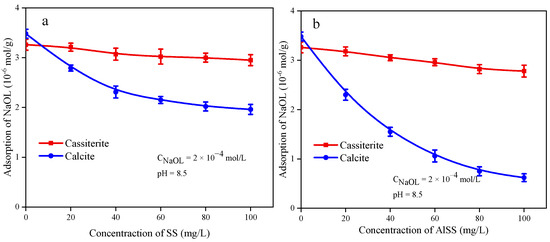 Amount of NaOL adsorbed on the surface of minerals as a function of the depressant concentration (a) SS and (b) AlSS.
