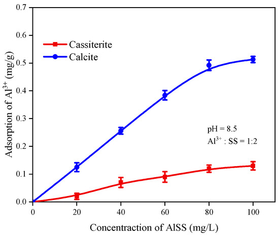 In addition to affecting the adsorption of the collector on the mineral surface, the depressants themselves also adsorb on the mineral surface. It has also been proved that there is competitive adsorption between depressant and collector on the mineral surface [29]. Figure 10 depicts the amount of Al3+ adsorbed on the cassiterite and calcite surface as a function of AlSS concentration. With the increase of AlSS concentration, the amount of Al3+ adsorbed on the cassiterite and calcite surface increases from 0 mg/g (without the addition of AlSS) to 0.13 mg/g and 0.52 mg/g, respectively at AlSS concentration of 100 mg/L. The results show that the adsorption of the collectors NaOL and the depressant AlSS on cassiterite and calcite surfaces are in inverse proportion, indicating that there should be competitive adsorption between NaOL and AlSS on the minerals surfaces.