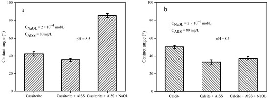 Contact angle of cassiterite (a) and calcite (b) in different systems.