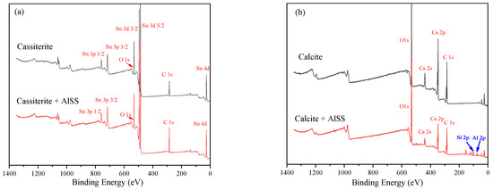Figure 13 demonstrates the survey scan XPS spectra of minerals before and after AlSS treatment. As shown in Figure 13a, except core peaks belonging to Sn, O, and C, there are no other peaks on the cassiterite surface, indicating the high purity of the sample. After being treated by the depressant AlSS, no new characteristic peak appears on the surface of cassiterite, which indicates that there is no adsorption of AlSS on the surface of cassiterite. The result is somewhat different from the previous adsorption measurement results, which may be related to the different sample preparation methods of the two test methods. In the preparation process of XPS measurement, the sample needs to be washed three times to reduce the residue on the mineral surface. If the adsorption capacity of the reagent on the mineral surface is small or not strong, it will be washed away. For calcite, as shown in Figure 13b, typical peaks, belonging to Al 2p and Si 2p, appeared on the spectrum of calcite after being treated by AlSS, confirming the adsorption of AlSS on the calcite surface. This inference can also be confirmed by the change of element content on the surface of calcite. As shown in Table 2, after being treated by AlSS, the relative atomic concentration of Al 2p and Si 2p on the calcite surface is up to 4.64% and 6.28%, respectively, which results in a corresponding decrease in the atomic concentration of Ca 2p.