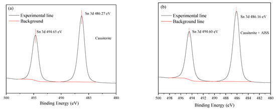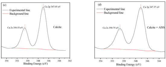 Figure 14 demonstrates the precise scan of Sn 3d core peaks and Ca 2p/2s core peaks on the cassiterite and calcite surface before and after being treated by AlSS. Generally speaking, the change of binding energy in the range of 0.2 eV may be caused by detection error. For a chemical reaction, the change of binding energy of metal elements on the mineral surface will be higher than 0.2 eV [29]. As shown in Figure 13a, in natural conditions, the binding energies of Sn 3d5/2 and Sn 3d3/2 in the spectrum of cassiterite are 486.27 eV and 494.65 eV, respectively. After being treated by AlSS, the binding energies of Sn 3d5/2 and Sn 3d3/2 are shifted to 486.16 eV and 494.60 eV, respectively. Because the peak shifts for Sn 3d5/2 and Sn 3d3/2 are very small (less than 0.2 eV), it can be inferred that the chemical environment of cassiterite surface is not changed by the addition of AlSS. For calcite, in the natural condition, the binding energies of Ca 2p and Ca 2s are 347.05 eV and 350.53 eV and shift to 347.37 eV and 350.75 eV, respectively, after being treated with AlSS. Because the change of binding energy of Ca 2p and Ca 2s on the calcite surface after AlSS treatment is 0.32 eV and 0.22 eV, respectively, it can be inferred that the adsorption of AlSS leads to the change of chemical environment on the calcite surface.