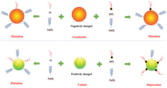 To express the whole flotation separation process more clearly, a diagram is drawn and shown in Figure 15. In the flotation separation pH of 8.5, the surface of cassiterite is negatively charged, while the surface of calcite is positively charged. In the presence of the depressant SS and the collector NaOL, a large amount of NaOL is adsorbed on both negatively charged cassiterite surface and positively charged calcite surface, so both of them has good floatability. At the same time, the recovery of calcite is lower than that of cassiterite because the SS adsorbed on the surface of calcite is more than that of cassiterite. In the presence of the depressant AlSS and the collector NaOL, a large amount of NaOL and a small amount of ALSS are still adsorbed on the cassiterite surface, so the cassiterite still has good floatability. However, AlSS can be adsorbed on the surface of calcite through a chemical reaction, which results in competitive adsorption with collector NaOL. As a result, there little NaOL and a lot of NaOL adsorbed on surface of the calcite, so the floatability becomes very poor.
