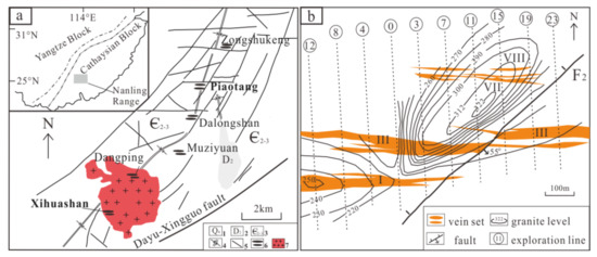 (a) A regional geological map of the Xihuashan–Piaotang mineralization belt (revised from [30]); (b) a planar view of the Piaotang deposit (revised from [31]). 1, Quaternary; 2, Middle Devonian; 3, Middle–Upper Cambrian; 4, axes of syncline; 5, fault; 6, vein–type tungsten deposits; 7, granite.