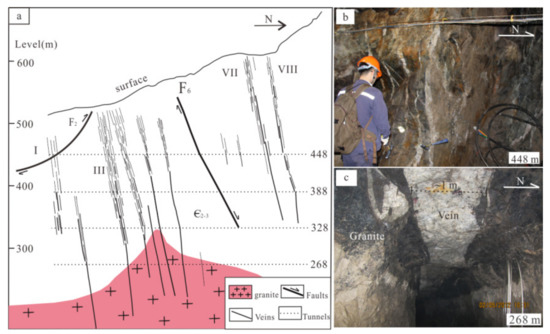 (a) A cross section of the Piaotang deposit along the 7th exploration line (revised from [31]). The dotted lines (e.g., 448 m) refer to the elevations of tunnels, and the Roman characters like III represent the vein sets. (b,c) are typical veins of the III vein set at the levels of 448 m and 268 m, respectively.