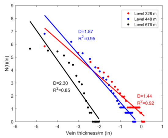 where represents the vein thickness, is the number of veins of size or larger, and is the fractal dimension that measures the degree of irregularity based on self–similarity. The slope of the log–log plot of against t is the opposite number of . Low values of mean that the vein network has high connectivity [46,49].