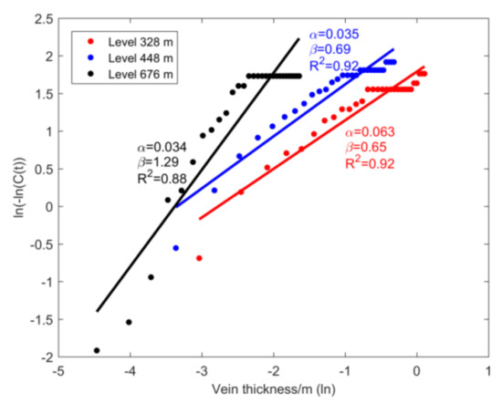 The vein thickness data at the three levels were fitted by a power law distribution. The fitting degrees at the levels of 328 m and 268 m are over 0.9, while the counterpart at the 676 m level is 0.85 (Table 1 and Figure 5). The fitted fractal dimensions decrease from the levels of 676 m to 328 m (Table 1). These vein thickness data were also fitted by a Weibull distribution. The fitting degrees are as good as those of the power law distribution (Figure 6). From Table 1, the Weibull modulus = 0.034 at the 676 m level is slightly lower than that ( = 0.035) at the 448 m level and much lower than that ( = 0.063) at the 328 m level.