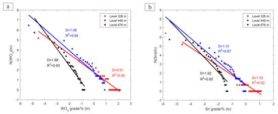 The fitting degrees of the WO3 grade data are higher than those of the vein thickness data (Figure 7). The veins at the 676 m level have the highest fractal dimension , followed by at the 448 m level and at the 328 m level. Compared with the WO3 grade data, the Sn grade data were fitted with slightly lower fitting degrees. The fractal dimension decreases from 1.62 at the 676 m level, 1.31 at the 448 m level, to 1.02 at the 328 m level.