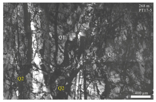 Two generations of quartz were also identified from the panchromatic CL images at the 448 m level (Figure 12). The CL–bright generation (Q1) of quartz shows growth zones with oscillating CL intensity and was crosscut by a late mesh-like CL–dark one (Q2). These two generations of quartz are ubiquitous in all the photographed veins.