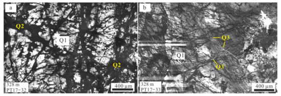 Composite SEM–CL panchromatic images of the samples PT17-32 (a) and PT17-33 (b) at the 328 m level. (a) The CL–bright generation of quartz (Q1) is crosscut by a late CL–dark generation of quartz; (b) The first generation of quartz (Q1) is crosscut by another late CL–bright generation of quartz (Q3), part of which was crystallized along micro fractures.