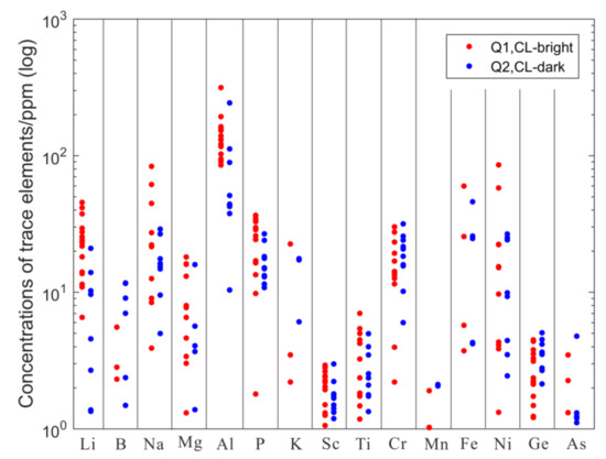 Quartz is considered to contain only small amounts of other elements (e.g., Al3+, Ga3+, P5+, Ti4+, Li+, Na+, and K+) because of a small ion radius of Si4+ and its high valence [83]. For the Piaotang deposit, Al is the only trace element whose concentrations reach up to hundreds of ppm (See Figure 13 and Table 3). Other abundant trace elements (>1 ppm) include P, Na, Fe, Li, B, Ni, Ti, Ge, Cr, Sc, K, Mg, Ge, and As. The Q1 quartz has higher concentrations of Li, Na, Al, P, and Ni and lower B and K than the Q2 quartz. Concentrations of Ti in the two generations of quartz are within a few ppm and have insignificant difference.
