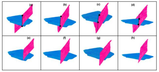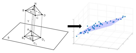 - Calculate the centroid coordinates and 2D fitting plane normal vector of the 3D fault point dataset. The plane equation () can be calculated according to the centroid coordinates and normal vector. Project the 3D points’ set to the 2D surface one by one and perform triangulation to generate a 2D triangular mesh surface.