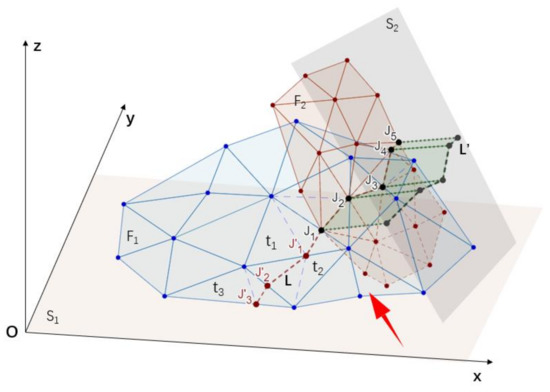 - Select one of the fault surfaces and calculate the intersection points on each triangle plane recorded in Step 1. One triangular patch may intersect with multiple triangular patches, resulting in multiple intersection points (Figure 6).