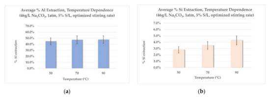 - Effect of temperature on Al and Si extraction: As seen from Figure 5a, the extraction rate of Al remains virtually unaffected in the range between 70 °C and 90 °C, while the increase observed with a temperature raise from 50 °C to 70 °C is small. Si extraction rates (Figure 5b) increase with an increase in leaching temperature. The choice of high leaching temperatures would make sense only if higher Al extraction could also be achieved to counterbalance this phenomenon. For this reason, a temperature of 70 °C was chosen for the next two series of experiments, as the middle-ground between acceptable Al extraction rates and corresponding low Si co-dissolution rates.