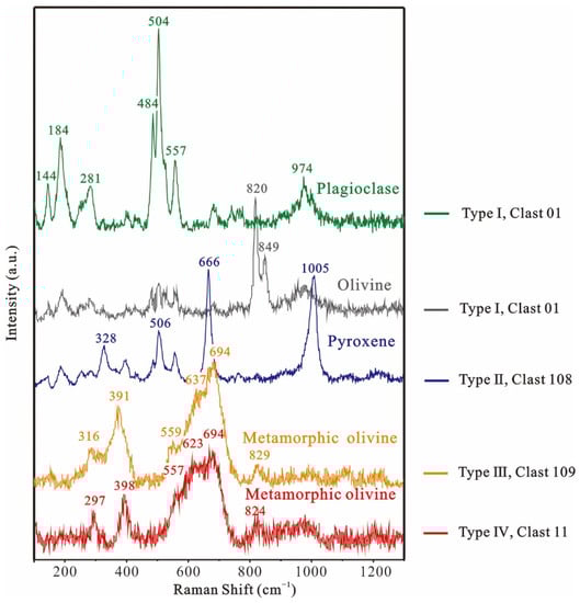 - Feng, L.; Lin, Y.; Hu, S.; Xu, L.; Miao, B. Estimating compositions of natural ringwoodite in the heavily shocked Grove Mountains 052049 meteorite from Raman spectra. Am. Mineral. 2011, 96, 1480–1489. [Google Scholar] [CrossRef]