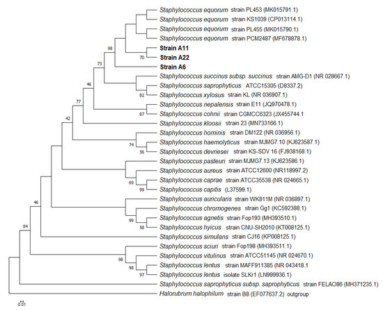 A total of 22 possible strains (named A1–A22) were isolated from the soil samples. All isolates were tested for the presence of urease activity. Three isolates were selected based on the time required for color turn when using Christensen’s media, considering that a lower time means a higher activity. Thus, three isolates with high ureolytic activity were identified phylogenetically based on 16S rRNA gene sequences through BLASTN (Table 1). The results indicated that all three selected isolates (A6, A11 and A22) correspond to Staphylococcus equorum, with a 99% similarity (99–100% coverage) (Table 1). A phylogenetic tree was generated based on the 16S rRNA. The relatedness of the sequences is shown in Figure 1. S. equorum has already been reported as a urease-positive bacteria [29]. Isolated A6, A11 and A22 were cultivated in liquid medium, and growth rates were individually determined. A11 isolated showed the higher growth rate and calcite production (data not shown), so it was selected for the following experiments. This isolate, from now on, will be simply referred to as S. equorum.