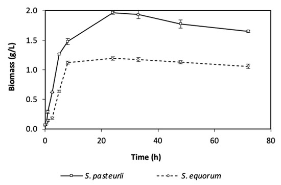 Pure cultures were cultivated in 100 mL of NB medium and 2% urea (20 g/L), in 250 mL flasks. Growing conditions were pH 7, 30 °C and shaking at 130 rpm. The cellular growth was determined during growth assays through tracking the optical density at a wavelength of 600 nm (OD600). Biomass concentration was computed through conversion of OD600 to suspended solids (SS) using a calibration curve. A specific calibration curve was recorded for every strain studied in this research, expressing biomass concentration as suspended solids. Assays were performed in triplicate.