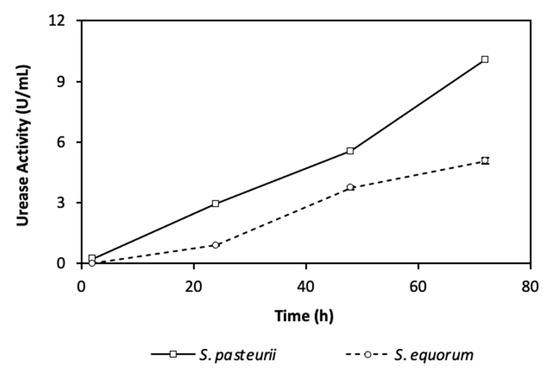 Figure 3 shows enzymatic activity evolution during growth assays. In the case of S. pasteurii, a maximal activity of 10 U/mL was observed by the end of the assay (72 h). S. equorum also showed a urease activity that increased with time, until a value of 5 U/mL. Similar values of urease activity have been reported for isolated strains from contaminated soils, ranging from 2 to 20 U/mL [21,24]. However, other authors have reported higher levels of urease activity [20,22,33].