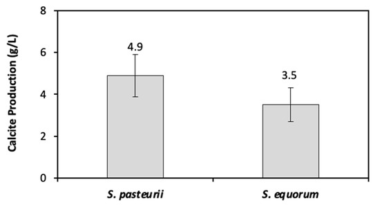 Calcite production by the end of precipitation assays for S. pasteurii and S. equorum. Bars indicate standard deviation.