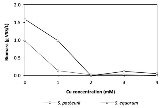 Copper tolerances of S. equorum and S. pasteurii were evaluated by determining biomass growth at copper concentration between 0 and 4 mM. The results, shown in Figure 6, indicate that MICs for S. pasteurii and S. equorum were around 1.5 and 0.8 mM, respectively, when biomass growth after 72 h was considered. Different researchers have reported MIC values for copper containing media in the range 0.2–0.5 mM for S. pasteurii [28], 0.2–0.5 mM for B. subtilis [41], 0.5–0.8 mM for Streptomyces sp. [42] and 3.9–4.7 mM for Sphingomonas paucimobilis [43]. On the other hand, some authors have reported high metal tolerance for bacteria strains isolated from contaminated soils, showing values up to 23 mM [44]. According to the results of this study, S. equorum has a lower copper tolerance than S. pasteurii. However, an optimization on the culture medium for S. equorum could improve the copper tolerance, as was also commented before for calcium removal. Additionally, heavy metal’s toxic effect on biomass growth could be overcome by a two-step process, where a first operation would produce the biomass, in absence of the toxic elements, with a second operation dedicated to the precipitation of calcium and/or heavy metals, as proposed by [10,45].