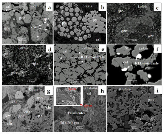 32]. The occurrence of fossilized organic matter and different morphologies of goethite and/or carbonate minerals (siderite) are common in the Lokris, Kastoria, Palaiochori, Katjeli, and other deposits (